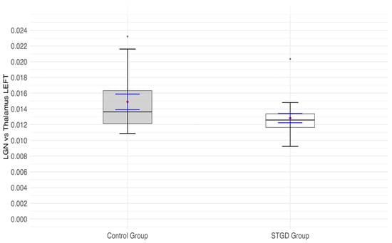 The box plot for the ratio of the left (lh) lateral geniculate nucleus (LGN) and left (lh) thalamus in the studied group (Stargardt disease—STGD) and control group. Red diamonds indicate the mean values, while blue lines represent confidence intervals.