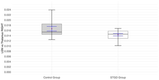 The insignificant result of the Student’s t-test (t(31) = 1.84; p = 0.076) indicated that the ratio of LGN to thalamus in the left hemisphere was not significantly lower in the group of patients with STGD than in the control group (Figure 4).
