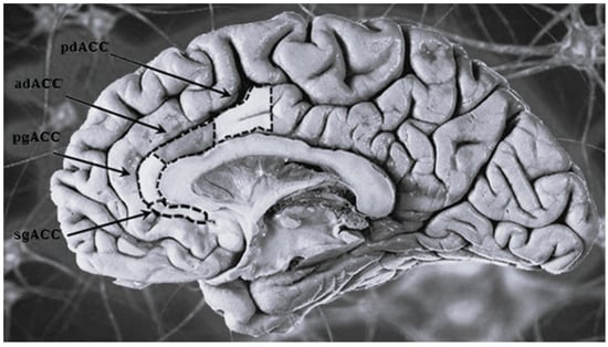 The figure shows the subregions of the anterior cingulate cortex (ACC), including the sgACC (free from copyright image, obtained from: https://debuglies.com/2020/10/26/sgacc-is-a-crucial-brain-region-links-to-depression-anxiety-heart-disease-and-treatment-sensitivity/ (accessed on 1 July 2025). original image was slightly edited with the sole purpose of better highlight the area of interest) [42].