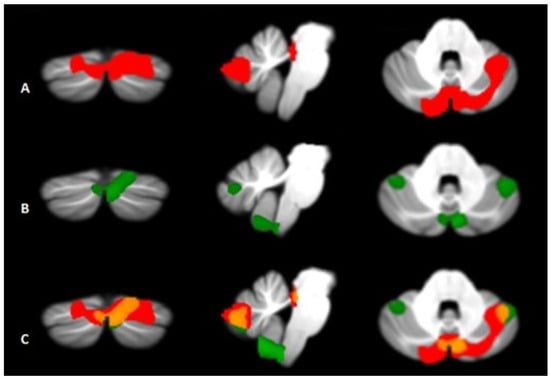 (A–C): Comparison of cerebellar density voxels of BD patients. There is a significantly reduced gray matter (GM) pattern in both BD-I (A) and BD-II (B) patients. The results are significant at p-values < 0.05 after correction at the FWE cluster level. The images are shown in neurological conventions. The overlapping cerebellar GM loss regions (C) between BD-I (red) and BD-II (green) are shown in orange (Property of: Olivito et al., 2022 [63]).