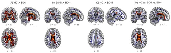(D) Amygdala: Considered as the “emotional center” of the brain, the amygdala plays an important role in interpreting and managing emotionally charged stimuli, especially negative and ambiguous ones. Since many patients with BD show difficulties in interpreting the emotional meaning of facial expressions, as well as in adapting themselves to changes in environmental contingencies—to which they usually react abnormally [45]—many studies have focused on the possible role of the amygdala in BD. Although the results are not always homogeneous, in general a marked hypoactivity of this structure has been observed, especially in patients with BD-II and in those with comorbid depression [46]. This hypoactivity has been associated, rather than with the presence of specific structural anomalies, with reduced connectivity between the amygdala itself and the orbitofrontal and dorsolateral cortices [47]. In contrast, in patients with BD-I and those with a predominance of manic states the amygdala was more often hyperactive [48]. There is also ample evidence that, while the volume of the amygdala appears generally smaller than normal in younger patients, in adults it tends to increase, sometimes even exceeding that of healthy controls [49,50]. More specifically, an analysis conducted using diffusion tractography documented a direct proportional relationship between the increase in amygdala volume and the course and severity of the disease [51]. These results, therefore, seem to support the existence of a positive correlation between the progression of BD and morphostructural changes.
