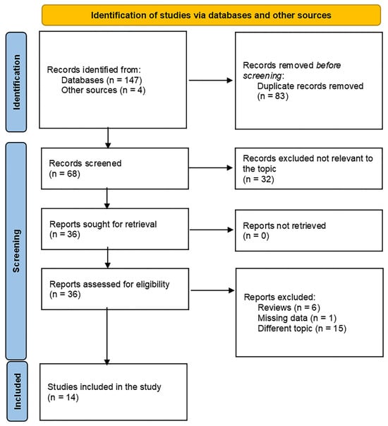 A total of 151 articles were identified through the initial searches of PubMed, Embase, Web of Science, CNKI, Wanfang Database, and Google Scholar. As depicted in the flow diagram (Figure 1), 83 duplicate records were excluded. Following title and abstract screening, 32 articles were excluded for not investigating the association between the HALP score and lung cancer. The remaining 36 articles underwent full-text assessment. Of these, 22 were excluded for the following reasons: being review articles (n = 6), not evaluating the prognostic value of the HALP score (n = 15), or providing no extractable data (n = 1). Consequently, 14 eligible articles, including 10,182 patients, were ultimately included in the current meta-analysis [,,,,,,,,,,,,,] (Table 1).