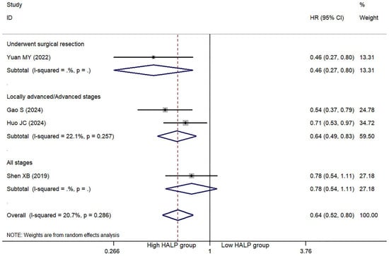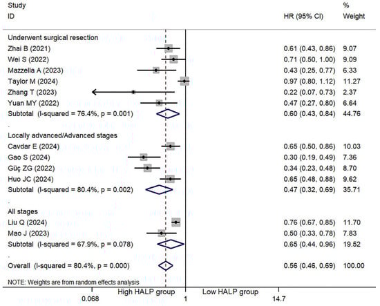 Furthermore, subgroup analyses were performed, consistently demonstrating a significant association between high HALP score and reduced mortality risk: for patients undergoing surgical resection, the univariate HR was 0.45 (95% CI = 0.30–0.68, p < 0.001) and the multivariate HR was 0.60 (95% CI = 0.43–0.84, p = 0.003); for patients with locally advanced or metastatic disease, the univariate HR was 0.55 (95% CI = 0.39–0.78, p = 0.001) (Supplementary Figure S1) and the multivariate HR was 0.47 (95% CI = 0.32–0.69, p < 0.001) (Figure 2); and for studies encompassing patients across all disease stages, the univariate HR was 0.47 (95% CI = 0.26–0.82, p = 0.008) and the multivariate HR was 0.65 (95% CI = 0.44–0.96, p = 0.029). Nevertheless, significant heterogeneity persisted within each subgroup, likely reflecting substantial variations in the disease stage distribution among the included studies.