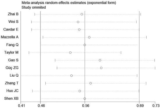 Substantial heterogeneity was observed across both the overall and subgroup analyses within the present study. Consequently, a sensitivity analysis was performed; the results demonstrated that the overall estimates remained statistically significant and stable following sequential exclusion of individual studies, indicating reliable findings despite the substantial heterogeneity (Figure 4). Furthermore, a publication bias assessment was conducted for studies investigating the association between the HALP score and OS in lung cancer. Funnel plot inspection revealed substantial publication bias (Supplementary Figure S4), which was statistically confirmed by both Begg’s test (p = 0.005) and Egger’s test (p = 0.003).