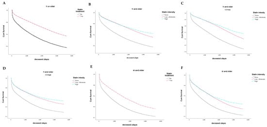 (A)—Survival of the statin-treated group compared to the statin-naïve group. (B)—Survival of the statin-treated group stratified to high-, low- or moderate-intensity statins compared to the naive group. (C)—Survival among patients with a CCI ≤ 4 in the statin-treated group compared to the statin-naive group. (D)—Survival among patients with a CCI > 4 in the statin-treated group compared to the statin-naive group. (E)—Survival among the oldest old (aged over 85 years), statin-treated group compared to the statin-naive group. (F)—Survival among the oldest old (aged over 85 years) statin-treated group stratified to high-, low- or moderate-intensity statins compared to the statin-naïve group. CCI—Charlson Comorbidity Index.