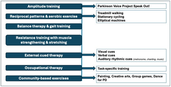 - Petzinger, G.M.; Fisher, B.E.; McEwen, S.; Beeler, J.A.; Walsh, J.P.; Jakowec, M.W. Exercise-enhanced neuroplasticity targeting motor and cognitive circuitry in Parkinson’s disease. Lancet Neurol. 2013, 12, 716–726. [Google Scholar] [CrossRef] [PubMed]