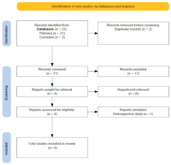 Initially, 21 potentially eligible articles were identified through the search strategy. After screening titles and abstracts, and subsequently reviewing the full texts, only four studies met all the predefined inclusion criteria. Of these four, one was excluded for being a retrospective cohort study rather than a randomized controlled trial. Ultimately, three randomized controlled trials were included in the final analysis. The process of study selection and reasons for exclusion at each stage are summarized in a PRISMA flow diagram (Figure 1), outlining the number of records identified, screened, excluded, and included in the final analysis. Although all studies employed artificial endometrial preparation, the luteal phase support protocols varied in terms of progesterone administration (route, dosage, and duration). Notably, one study, Wang et al. [23], did not fully specify the details of the luteal support provided. This clinical heterogeneity is a potential source of bias and may influence the overall results. Not all studied outcomes were available in every trial; for example, analyses of live birth rate and positive pregnancy test rate were limited to two out of three studies, further reducing power and the robustness of pooled estimates.