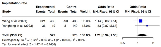 Two of the three studies, Wang et al. [23] and Yanghong et al. [9], assessed implantation rate. The pooled analysis demonstrated a tendency towards increased implantation in the intervention group in comparison with the control group (61.6% [357/579] vs. 56% [321/573]; OR 1.21; 95% CI 0.94–1.55; p = 0.14; I2 = 0%), although this did not reach statistical significance (Figure 2).