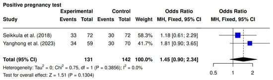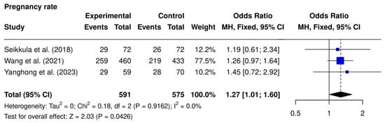 Three studies were included [9,10,23]. The intervention group demonstrated significantly higher clinical pregnancy rates compared to the controls (56.5% [317/561] vs. 47.4% [272/575]; OR 1.27; 95% CI 1.01–1.60; p = 0.0426; I2 = 0%) (Figure 5).