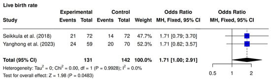 Two studies, Seikkula et al. [10] and Yanghong et al. [9], assessed LBR. The meta-analysis revealed a significantly higher LBR in the intervention group (34.3% [45/131] vs. 23.9% [34/142]; OR 1.71; 95% CI 1.00–2.91; p = 0.0483; I2 = 0%). (Figure 4).