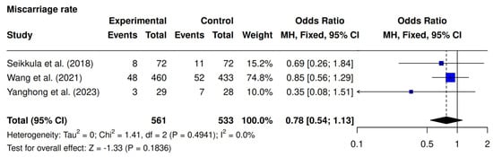 Three studies assessed miscarriage rates [9,10,23]. No significant difference was observed (10.5% [59/561] vs. 13.1% [70/533]; OR 0.78; 95% CI 0.54–1.13; p = 0.1836; I2 = 0%) (Figure 6).