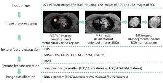 The study workflow on PET/MR images of non-small cell lung cancer (NSCLC) including both adenocarcinoma (ADC) and squamous cell carcinoma (SCC). Images were pre-processed to segment regions of interest (ROIs). From given ROIs, texture features were extracted using first-order statistics (FOS), second-order statistics (SOS), and fractal dimension texture analysis (FDTA). Informative texture features were selected using random forest algorithm. Based on the selected texture features, images were classified using k-nearest neighbors (kNN) algorithm.