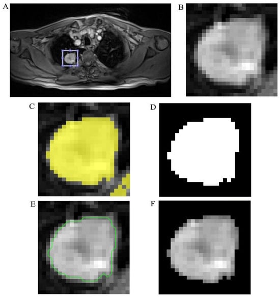 The segmentation process of MR image. (A) Non-small cell lung cancer (NSCLC) localization on input MR image. (B) Delineation of the region of interest (ROI). (C) Thresholding and binarization. (D) Resulting binary masks. (E) Contour enhancing (green line). (F) Final segmented ROI exporting.