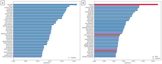 The importance of texture features selected for the non-small cell lung cancer (NSCLC) subtype classification based on MR images. Texture features selected from (A) FOS/SOS dataset and (B) FOS/SOS/FDTA dataset using the random forest algorithm. Selected FDTA features are additionally marked in red.