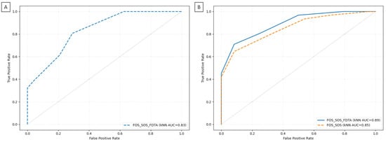 Receiver operating characteristic (ROC) and area under curve (AUC) of the k-nearest neighbors (kNN) algorithm, comparing classification efficiency between the radiomic analysis-based identification and the histological confirmation of the non-small cell lung cancer (NSCLC) subtypes. (A) ROC curve returned for texture features from the FOS/SOS/FDTA dataset, which differed significantly between adenocarcinoma (ADC) and squamous cell carcinoma (SCC) MR images. (B) ROC curves returned for texture features from the FOS/SOS and FOS/SOS/FDTA datasets, which were selected using the random forest algorithm.