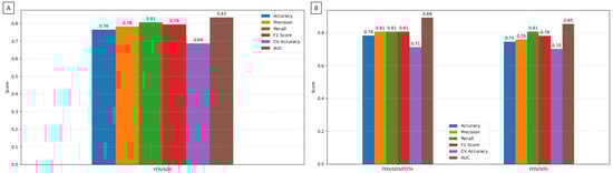 These ROC findings were supported by classification metrics, all of which exceeded 0.70 in accuracy. The highest classification performance was achieved by the kNN algorithm using the feature set selected from the FOS/SOS/FDTA dataset, with an accuracy of 0.78, precision of 0.81, and F1 score of 0.81. Slightly lower performance was observed for the FOS/SOS/FDTA dataset containing only features that significantly differed between ADC and SCC (accuracy: 0.76; precision: 0.78; F1 score: 0.79), and the lowest performance was seen with the feature set selected from the FOS/SOS dataset (accuracy: 0.75; precision: 0.76; F1 score: 0.78). CV accuracy was also highest for the feature set selected from the FOS/SOS/FDTA dataset (0.71), followed by the FOS/SOS dataset (0.70), and was lowest for the FOS/SOS/FDTA dataset containing only significantly different features (0.69). For all datasets, recall remained consistent at 0.81 (Figure 5).