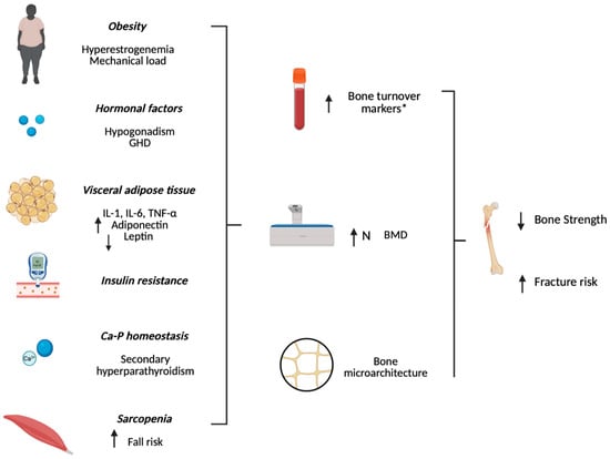 Endocrine dysregulation is another critical factor. Obesity is associated with dysregulation of the GH/IGF-I and gonadal steroid axes, both crucial for bone homeostasis [17,18]. Visceral obesity can lead to a condition of relative GH deficiency (GHD) [17], which is associated with reduced bone mass and increased fracture risk, since GH stimulates osteoblast differentiation [17] and IGF-1 influences cortical bone structure, a major determinant of bone strength [19]. Moreover, GHD plays a significant role in modulating body composition, increasing abdominal adiposity, and decreasing muscle mass [19]. Additionally, obese males often exhibit reduced testosterone, a positive determinant of BMD and muscle mass, while estrogen production increases with body weight in both sexes [18].