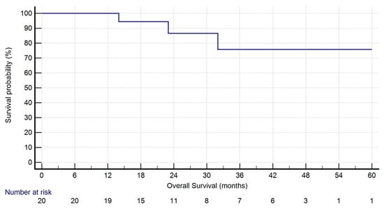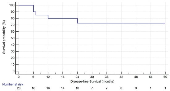 During follow-up (median: 27.5 months [IQR: 16.75–44.50]), five patients (25.0%) developed recurrence: two had isolated locoregional lymph node recurrence, while three showed both local and distant progression. One-year survival was 95.0%. At the time of last follow-up, 19 patients (95.0%) were alive. Kaplan–Meier curves for OS and DFS are presented in Figure 1 and Figure 2.