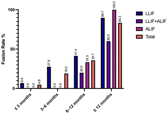 Fusion rates separated by cohort and post-operative follow-up intervals. Satisfactory fusion was defined as Bridwell interbody fusion grade 1 or 2, and was calculated cumulatively. The 3–6-month interval includes assessments performed > 3 and ≤6 months postoperatively; the 6–12-month interval includes assessments performed > 6 and ≤12 months postoperatively. The ≥12-month category represents the final cumulative fusion rate, reflecting the earliest time at which satisfactory fusion was confirmed for each patient and carried forward, with final follow-ups extending up to 25 months.