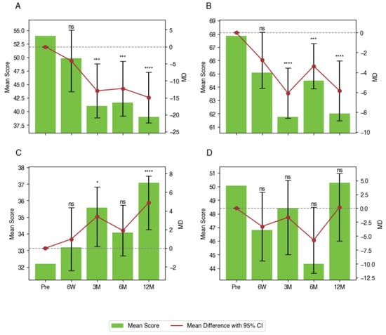 Findings from the LMM analysis revealed statistically significant improvements across several PROMs compared to pre-operative baseline values. For ODI, significant improvements were observed at 3 months (MD −13.0 points with 95% CI −20.9 to −5.0 points, p < 0.001), 6 months (MD −12.3 points with 95% CI −20.4 to −4.2 points, p < 0.001), and 12 months (MD −14.9 points with 95% CI −22.4 to −7.5 points, p < 0.001). PROMIS Pain Interference scores demonstrated significant reductions compared to baseline values, with improvements at 3 months (MD −6.1 points with 95% CI −8.6 to −3.6 points, p < 0.001), 6 months (MD −3.4 points with 95% CI −5.6 to −1.1 points, p < 0.001), and 12 months (MD −5.8 points with 95% CI −8.9 to −2.8 points, p < 0.001). For PROMIS Physical Function scores, significant improvements were observed after 3 months (MD +3.4 points with 95% CI 0.2 to 6.6 points, p = 0.032) and 12 months (MD +4.9 points with 95% CI 2.0 to 7.8 points, p < 0.001). Improvements after 6 months (MD +1.9 points with 95% CI −0.8 to 4.6 points, p = 0.362) were observed but did not reach statistical significance. PROMIS Depression scores showed mixed results, with reductions observed after 6 months (MD −5.7 points with 95% CI −11.7 to −0.2 points, p = 0.065) that did not reach statistical significance. After 12 months, scores returned near-baseline levels (MD +0.2 points with 95% CI −5.9 to 6.3 points, p = 0.999). These findings indicate that the greatest benefits were observed within the first 12 months post-operatively, with significant improvements across multiple instruments (Table 5, Figure 2).