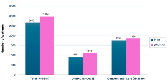 A total of 5644 patients with HF were included in the study. Of these, 2034 patients (36%) were managed through the UMIPIC multidisciplinary care model, while 3610 (64%) received conventional follow-up as recorded in the RICA registry. In the overall cohort, 52.7% were women (n = 2974), and in the UMIPIC group, 55% were women (n = 1118) (Figure 1). The proportion of women included in the UMIPIC program was significantly higher than in the group receiving conventional follow-up (55% vs. 51%; p = 0.01).