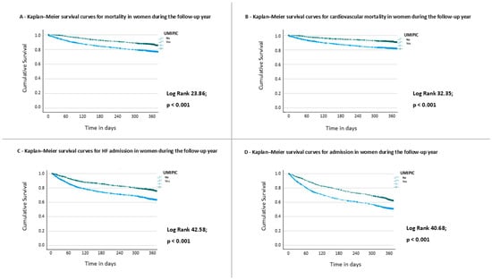 Outcomes during the follow-up in women. Kaplan–Meier curves for (A) all-cause mortality; (B) cardiovascular mortality; (C) heart failure admission; and (D) any-cause admission, during the one-year follow-up.