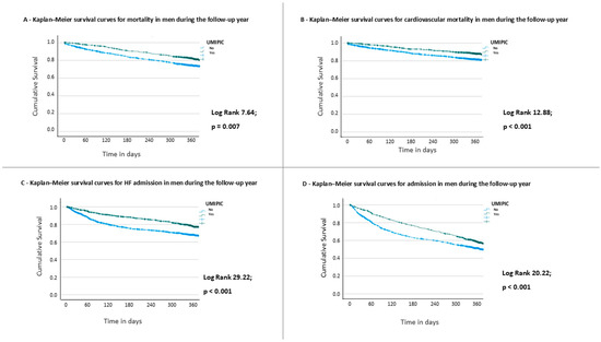 Outcomes during the follow-up in men. Kaplan–Meier curves for (A) all-cause mortality; (B) cardiovascular mortality; (C) heart failure admission; and (D) any-cause admission, during the one-year follow-up.