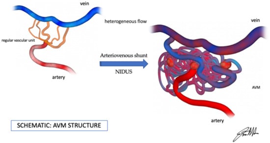 Among these, cerebral arteriovenous malformations are characterized by a complex tangle of dysplastic vessels known as the nidus, which directly connects the arterial and venous systems without the normal capillary bed. AVMs are a significant cause of spontaneous intracerebral hemorrhage, particularly in young adults, and carry substantial morbidity and mortality risks [1,2].