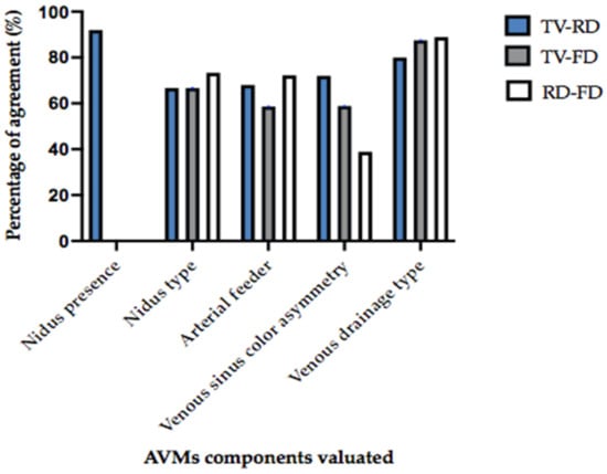 Histogram of the percentage of agreement (Y-axis) in evaluating the different AVM components (X-axis) between different operators. The “nidus presence” has been evaluated between the expert neuroradiologist and non-expert neuroradiologist (“TV”, ”RD”) only. All the other components have been evaluated by the two neuroradiologists and the angiographer (FD). The highest percentage of agreement (from 80% to 88,9% in percentage, and Cohen’s K from 0.56 to 0.75) was found in evaluation of the venous drainage type between all three operators.