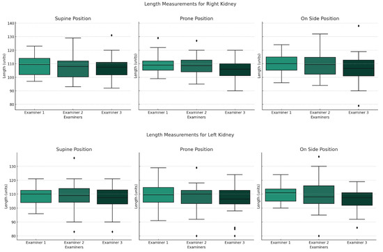 All examiners were analyzed separately; none was treated as the reference. The distribution of renal measurement results and the differences between examiners in relation to body position are presented in Figure 1. Examiner 1 has the highest average results, followed by Examiner 2 and finally Examiner 3. Examiner 3 tends to underestimate kidney measurements in most positions.