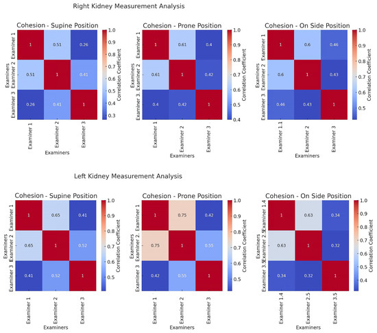 Cohesion heatmaps. These heatmaps display the correlation coefficients between measurements taken by different examiners for each position. A higher correlation coefficient indicates a stronger agreement in measurement patterns between the examiners.