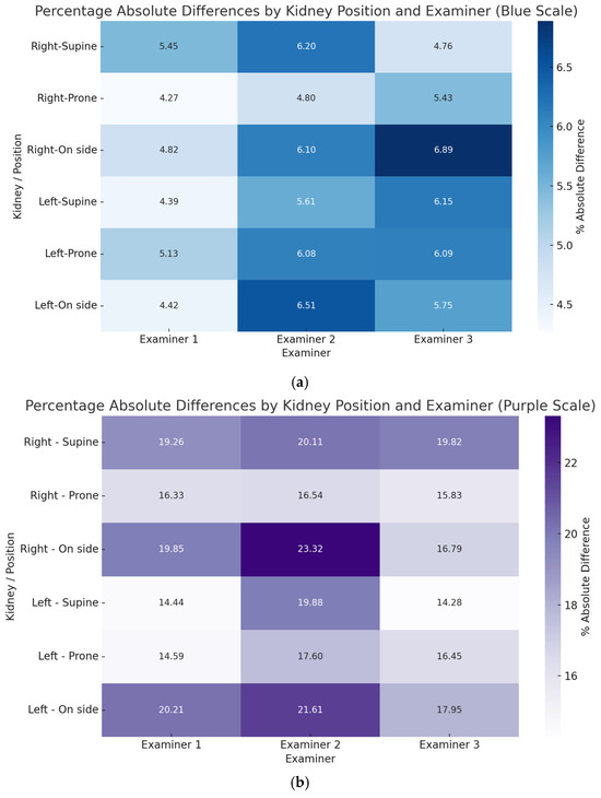 Heatmaps show the Percentage Absolute Differences (PADs) values across different positions for each examiner and kidney, visually comparing variability (a) for the kidney’s length and (b) for the kidneys volume.