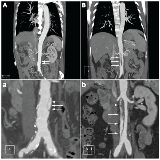 - Liu, J.-P.; Liu, F.-E.; Duan, Q.; Ye, R.; Xiao, J.-Q. Spontaneous isolated dissection at renal upper abdominal aortic: A rare case report. Int. J. Clin. Exp. Med. 2015, 8, 8190. [Google Scholar] [PubMed]