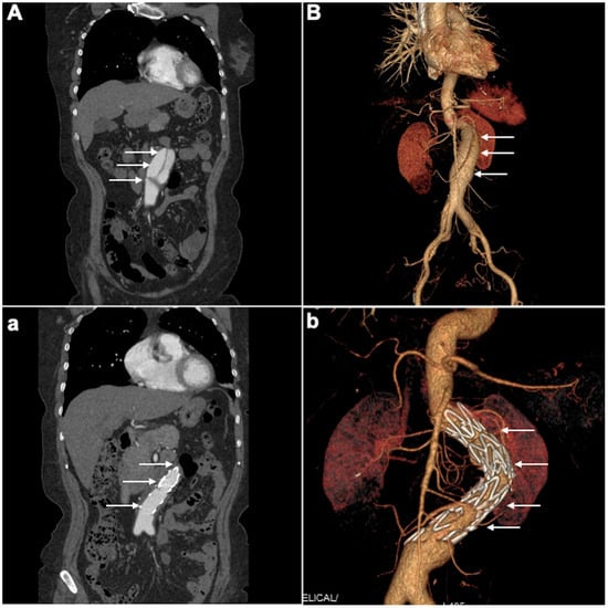 - Chaikof, E.L.; Dalman, R.L.; Eskandari, M.K.; Jackson, B.M.; Lee, W.A.; Mansour, M.A.; Mastracci, T.M.; Mell, M.; Murad, M.H.; Nguyen, L.L. The Society for Vascular Surgery practice guidelines on the care of patients with an abdominal aortic aneurysm. J. Vasc. Surg. 2018, 67, 2–77.e2. [Google Scholar] [CrossRef] [PubMed]
