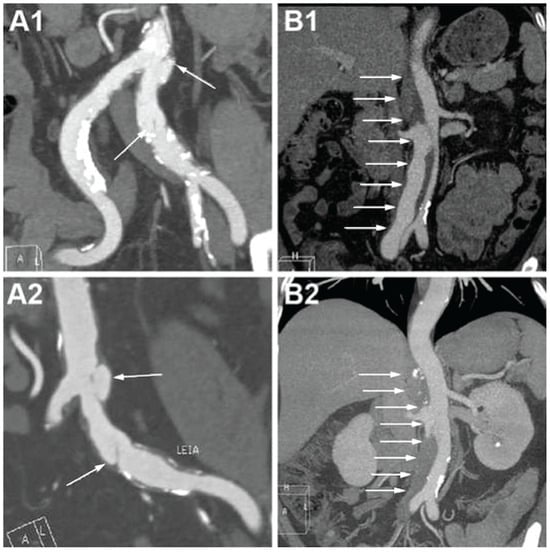 - Böckler, D.; Massoni, C.B.; Geisbüsch, P.; Hakimi, M.; von Tengg-Kobligk, H.; Hyhlik-Dürr, A. Single-center experience in the management of spontaneous isolated abdominal aortic dissection. Langenbecks Arch. Surg. 2016, 401, 249–254. [Google Scholar] [CrossRef] [PubMed]