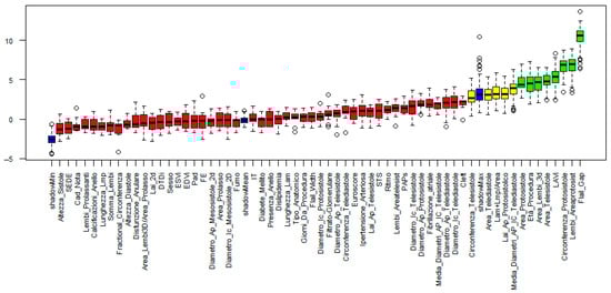 Feature selection results obtained using the Boruta algorithm (full variable set). Variables are ranked based on their importance in the classification task. Green bars indicate features confirmed as relevant, yellow bars represent tentative features, and red bars denote features rejected as non-informative for predicting the outcome.