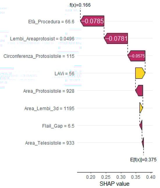 To enhance interpretability and support clinical decision making, SHapley Additive exPlanations (SHAP) analysis was applied. The global SHAP summary plot (Figure 2) revealed that Flail Gap, age at the time of procedure, and indexed left atrial volume (LAVi) were the most influential predictors of recurrent mitral regurgitation. Additionally, SHAP force plots (Figure 3) provided individualized explanations of model predictions, highlighting patient-specific risk profiles.