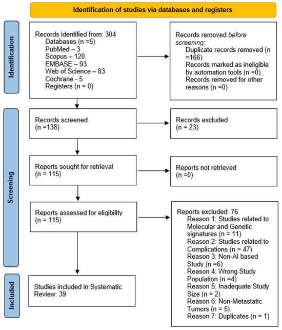 Among the 39 studies, the three most common primary tumor types were lung cancer, breast cancer, and prostate cancer, as reported in 22 (56.4%), 20 (51.3%), and 16 (41.0%) studies, respectively (Table 2 and Figure 2). In contrast, neuroendocrine tumors, bladder cancer, and sarcoma were the least common, each reported in two (5.1%), three (7.7%), and three (7.7%) studies, respectively (Table 2). In addition, we also analyzed the primary data modalities used to train and validate the AI models across all 39 studies. Out of the 39 studies included in our systematic review, 20 studies (51.3%) used magnetic resonance imaging (MRI) as the primary data source for their models. In comparison, 17 studies (43.6%) utilized computed tomography (CT), whereas the two remaining studies were based on non-imaging data, such as clinical text for a large language model (LLM) or clinical variables for survival prediction [10,11].