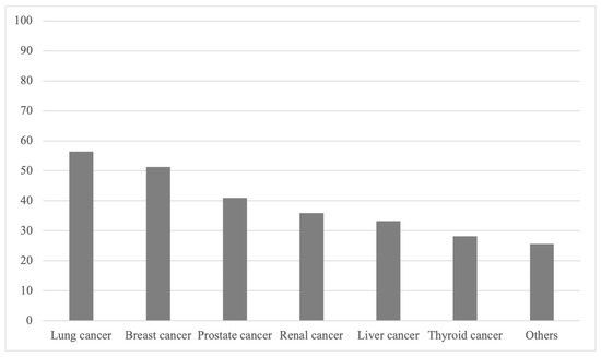 The frequency of primary tumor types is shown. Lung cancer proved to be the most common type of cancer analyzed, whereas neuroendocrine tumors were the least common.