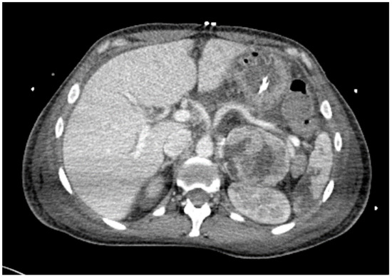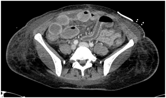 After the operation, the case was discussed at multidisciplinary setting (surgeons, anesthesiologists, radiologists and endocrinologist), and it was decided that the radiological characteristics of the adrenal gland lesion were suggestive of an intra-adrenal paraganglioma. Therefore, left adrenalectomy was indicated. After achieving hemodynamic stabilization sufficient for surgery, the patient underwent an open left adrenalectomy, followed by continued open abdominal management (Figure 3). After 72 h, further surgical revision was performed with the creation of an ileo–ileal and colon–rectal anastomosis and closure of the abdomen. After seven days, the patient’s general condition worsened again. A second surgical intervention was performed due to the dehiscence of the ileal anastomosis and perforation of the appendix. Both the anastomosis and appendix were resected, and open abdomen management with the application of a negative pressure device was initiated and completed after 48 h with an ileostomy. After about 4 days, the patient developed an acute ischemia of the left lower limb on an embolic basis and therefore intravenous sodium heparin was started. The initiation of anticoagulant therapy after about 3 days caused a massive hemoperitoneum with hemorrhagic shock induced by bleeding from collateral branch of superior mesenteric artery and retroperitoneum so a damage control surgery with packing was carried out. At new surgical abdominal look packing was removed. Despite medical therapy with noradrenaline and the surgical interventions, the state of septic shock induced by A. Baumannii infection worsened. After all, the patient developed a persistent Disseminated Intravascular Coagulation (DIC) even though repeated platelet, coagulation factors and fresh plasma transfusion. As a result of persistent DIC, the left lower limb underwent necrosis, and it was amputated.
