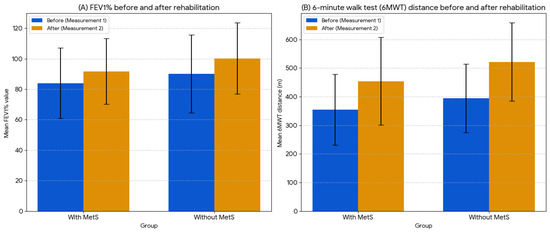 Figure 2 compares the mean FEV1% and 6MWT before and after rehabilitation within the pre- and post-rehabilitation groups. Improvements in FEV1 and the 6MWT were observed in both patients with and without metabolic syndrome. Patients with MetS achieved significant improvements in the 6MWT (p < 0.001) and FEV1 (p = 0.025). Patients without MetS also achieved significant improvements in the 6MWT (p < 0.001) and FEV1 (p = 0.021).