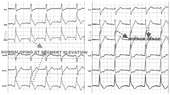 While the classic Brugada pattern displays a coved ST-segment elevation in the right precordial leads (V1–V3), studies report that ~9–10% of patients may also show a type 1 ST elevation in at least one peripheral lead, mainly in aVR and in the inferior leads, and this is independently associated with malignant arrhythmic events [26]. These results agree with numerous other reports in the literature regarding an idiopathic elevation of the J point and ST segment in the inferior leads with an increased tendency to ventricular arrhythmias [27,28,29,30]. An ECG showing a significant ST-segment elevation in a patient with Brugada syndrome is shown in Figure 4.