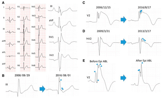 (A). ECG recorded in a 61-year-old male who experienced syncope at night. VF was detected 57 months after ICD implantation. hV1–hV6 are placed one intercostal space higher than the regular lead positions (V1–V6). Multiple R waves existed in leads II, III, aVF, V1, hV1, and hV2, and fragmented QRS were present in leads reflecting alteration in the inferior and RVOT regions. (B–D). Progressive increments of QRS fragmentation (arrowheads indicate new QRS spikes that appeared during follow-up). (E). Effect of epicardial ablation of the right ventricle: Before ablation, five spikes (arrowheads) were observed within QRS complex in lead V2. After ablation, only three spikes (arrowheads) can be seen, with a reduction in ST-segment elevation. Reproduced with permission from Morita et al. [48].