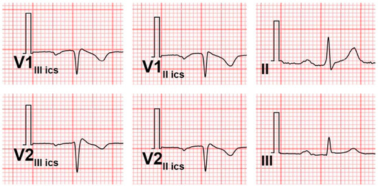 A common but often underdiagnosed sign is the depression of the ST segment in the inferior leads. It is recognizable in approximately 50% of patients with Brugada syndrome, even in those where the pattern in the precordial leads at the fourth intercostal space is not immediately visible [21,22]. In particular, Crea et al. performed an analysis of 87 patients with a spontaneous type 1 Brugada pattern, showing that 47% exhibited ≥0.1 mV ST depression lasting ≥0.08 s in leads II, III, or aVF [21,23]. The pattern can be recognized more easily in inverted mirror image tracing, which can be obtained by flipping the paper and analyzing it with a backlight. Once the ST-segment depression is recognized, the precordial leads can be placed at the second and third intercostal spaces to try to observe the pattern.