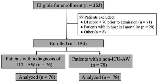This study is a multicenter prospective observational design conducted on sepsis patients admitted to the intensive care unit (ICU) and emergency departments of four acute care hospitals in Nagano Prefecture, Japan, from April 2020 to March 2023. Patients were included if they were 18 years or older, had received intensive treatment, and were diagnosed with sepsis [18] (defined as two or more criteria of systemic inflammatory response plus a proven or strongly suspected infection), sepsis with organ failure, or septic shock (sepsis with hypotension unresponsive to fluid resuscitation). To be enrolled, patients also needed to meet the criteria for baseline functional independence, defined a priori as a barthel index (BI) score ≥ 70, obtained from a proxy describing the patient’s functional status prior to admission [19,20]. The following conditions, which could influence the diagnosis of ICU-AW, were excluded from the analysis: head trauma, burns, spinal cord injury, multiple fractures, septic shock unresponsive to treatment, and patients with in-hospital mortality. A flowchart of patient enrollment is shown in Figure 1.