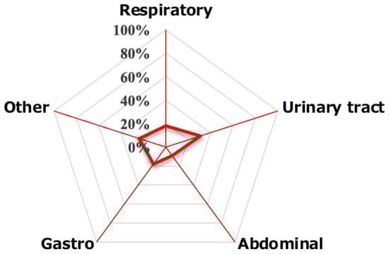 These patients also had a significantly slower start of mobilization and a lower BI (p < 0.05). Finally, the breakdown of the source of infection in ICU-AW patients was 31% urinary tract, 18% respiratory tract, 18% gastroenteritis, 9% abdominal, and 24% other, with urinary tract being the most common (Figure 2).