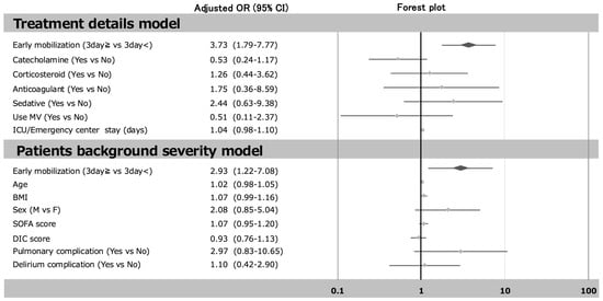 The relationship between early mobilization (3 day≧ vs. 3 day<) and the incidence of ICU-AW. Multivariable analysis indicates the adjusted by early mobilization, catecholamine, corticosteroid, anticoagulant sedative use MV and ICU/Emergency center stay (treatment details model), and early mobilization, age, BMI, sex, SOFA score, DIC score, pulmonary complication, and delirium complication (patient background severity model). Abbreviations: OR, odds ratio; CI, confidence interval.