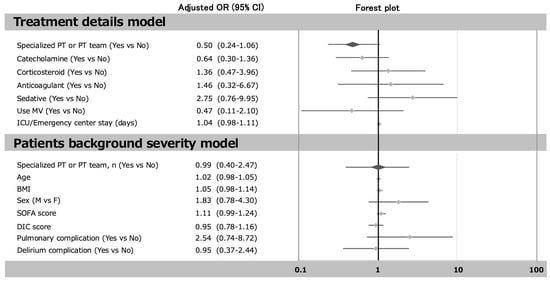 The relationship between presence or absence of a dedicated team or physiotherapist and the incidence of ICU-AW. Multivariable analysis indicates the adjusted by early mobilization, catecholamine, corticosteroid, anticoagulant sedative use MV and ICU/Emergency center stay (treatment details model), and early mobilization, age, BMI, sex, SOFA score, DIC score, pulmonary complication, and delirium complication (patient background severity model). Abbreviations: OR, odds ratio; CI, confidence interval.