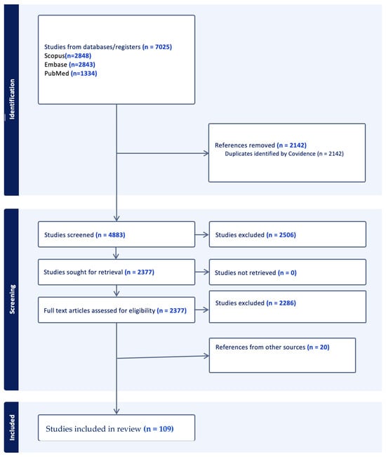 After deduplication and full-text screening, 109 studies met the inclusion criteria and were included in the final review. These studies were grouped into five thematic areas: (1) image preprocessing and segmentation, (2) diagnosis and classification, (3) prediction and prognosis, (4) multimodal data fusion, and (5) emerging trends.
