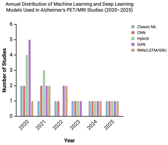 Bar chart illustrating the annual distribution of ML and DL model types used in Alzheimer’s disease PET/MRI studies included in this review, from 2020 to 2025. In 2020 generative adversarial networks (GANs) and hybrid models were most prominent. By 2023–2025, the relatively equal distribution across technologies suggests a stabilization in modeling strategies.